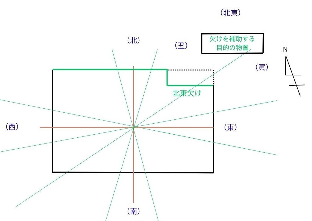 北東敷地欠けであれば本宅北東は張りにせず(この場合は張りにすると問題もあるため)物置によって北東の積み上げの補助として用います。酉から戌方位に物置を置き、一世代が困らないように金運を強めるのも有効と言えます。(酉の場合は得るお金、戌の場合は親などの援助。お金を管理する意味では戌がおすすめです)