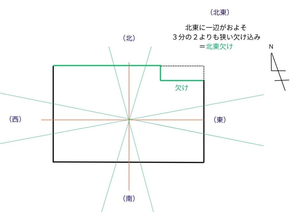 北東は敷地が欠けても本宅が欠けても大凶の分類です。北東は跡継ぎ(家長/夫)・長男・または次男を扱う事が多く、本宅か敷地が欠けると切り替えにおいて大凶となりますが、現代では何らかの理由によって家に留まらない(家を出る)と解釈を変える事ができます。